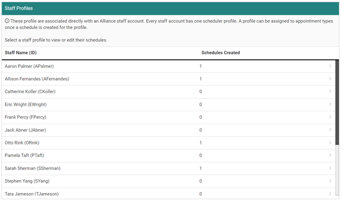 From this screen you can select a staff profile to view and edit their existing schedules or create a new one.