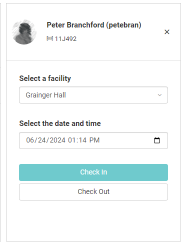 If the facility you selected allows check-ins and check-outs, you can also click Check Out to create a record for that user.