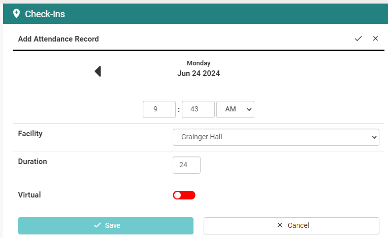 If the selected facility allows in-person check ins (from the staff terminal) and virtual check-in (from the participant Home page), you can specify whether this record is a virtual check-in or not using the toggle.