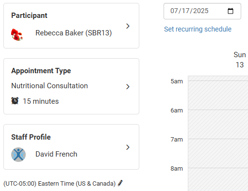 Once you have selected a Participant, Appointment Type, and Staff Profile while scheduling an appointment, the Set recurring schedule link will appear under the date selection tool.
