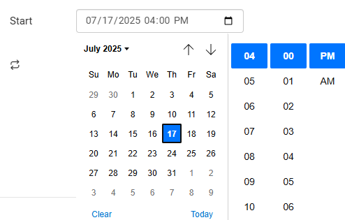 The appointment series defaults to starting on today's date at the next hour. You can manually type the date and time to update it, or select the calendar icon to the right of the date and time. This will expand a calendar and time tool.