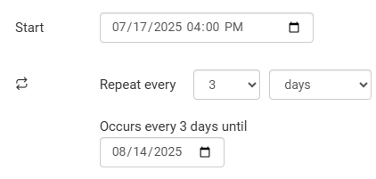 When an appointment repeats every 3 days starting on July 17, the next three appointments will occur on July 20, July 23, and July 26. This will continue until the end date of August 14.
