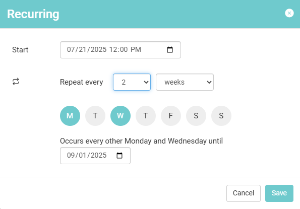 When appointments repeat every 2 weeks on Monday and Wednesday from 7/21/25 to 9/1/25, the appointments will be scheduled on the following dates: