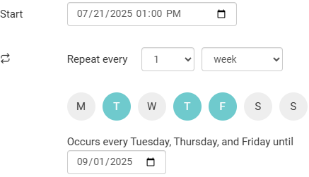 Appointments are scheduled on the selected day(s) of the week depending on the week interval used. You can select one or multiple days to repeat the appointment on.