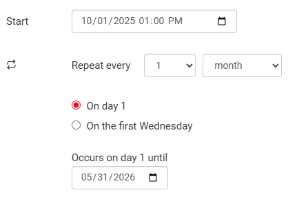 If you schedule an appointment to repeat on day 1 from 10/1/25 to 5/31/26, an appointment will be added on the first day of each month resulting in 8 appointments added.