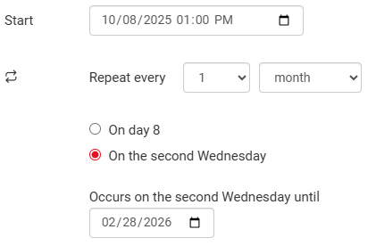 The first appointment occurs on 10/8/25, which is the second Wednesday of the month. The rest of the appointments will occur on the second Wednesday of each month from November 2025 to February 2026: