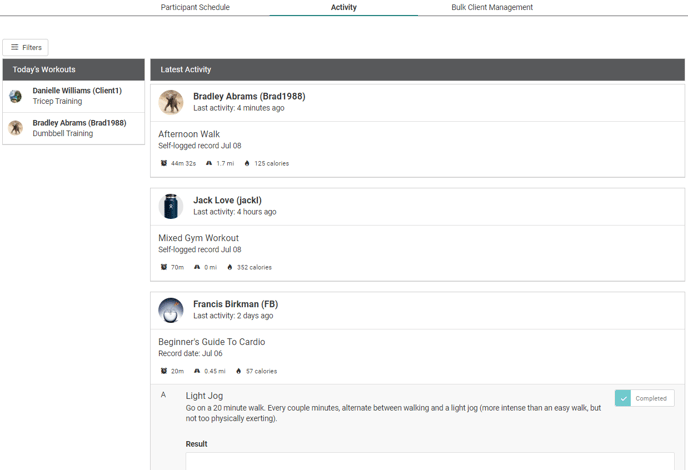 The Activity page is where you can view the previous and upcoming workouts for your population.