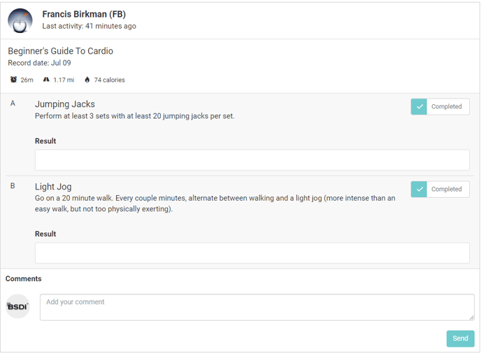 If the record used a workout created in the Workout Builder, the exercise information will be displayed, and there is an option to leave a comment for the user under the exercises.