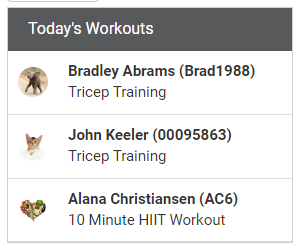Also on the Activity page is the Today's Workouts section that displays the workouts scheduled for your "subscribed" members for today. Read about how to add members to your subscriptions in this article.