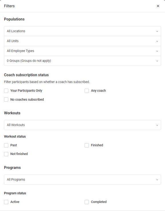 By default you will see workout information for all members at your permitted locations. You can use filters to narrow the results down to specific populations, workout or program types, or to only view members you are subscribed to (more on that later!).