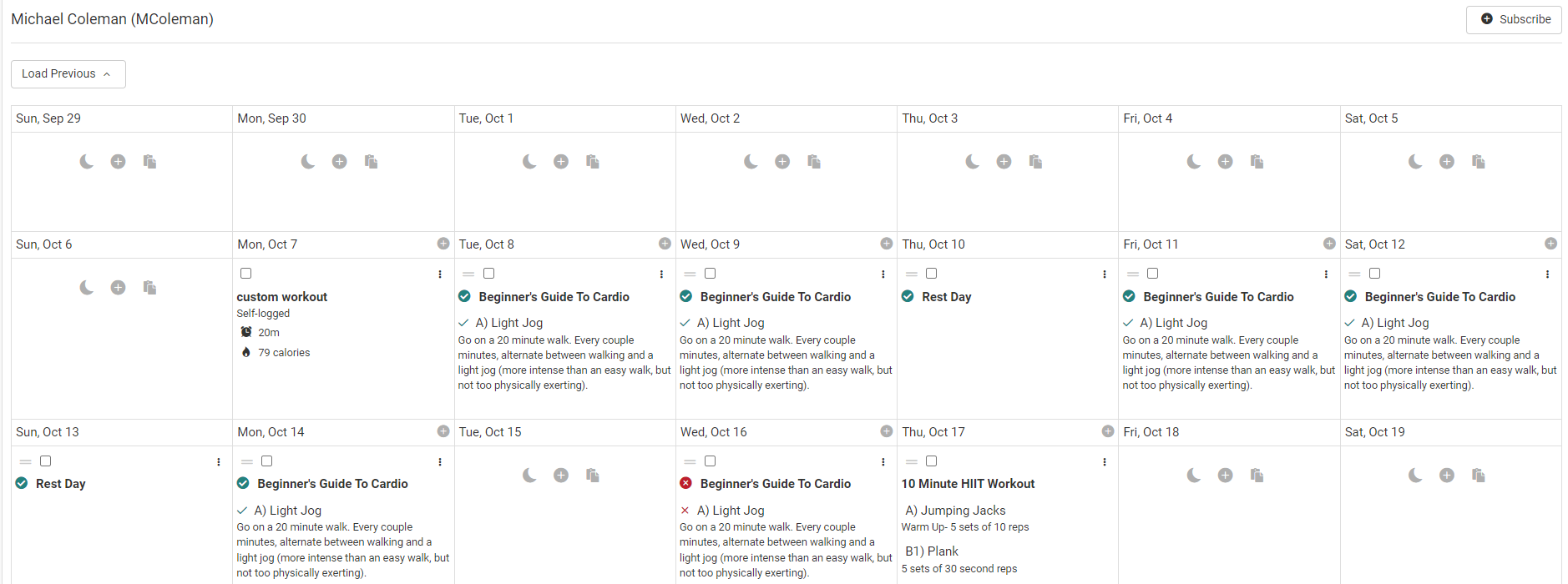 If you click the name of a user from one of the Latest Activity records, you will be taken to the Participant Schedule page. Here you will see this member's workout calendar that contains previously assigned/completed workouts, as well as upcoming scheduled workouts.