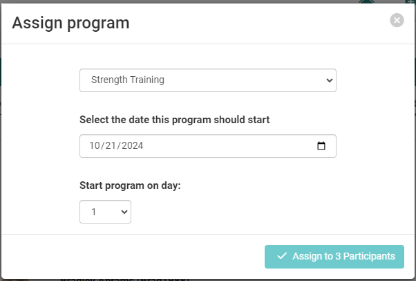 - Assign program: Schedule a workout program for the selected members. The program can start on today's date or a future date, and can begin from the start of the program or partway through the program.