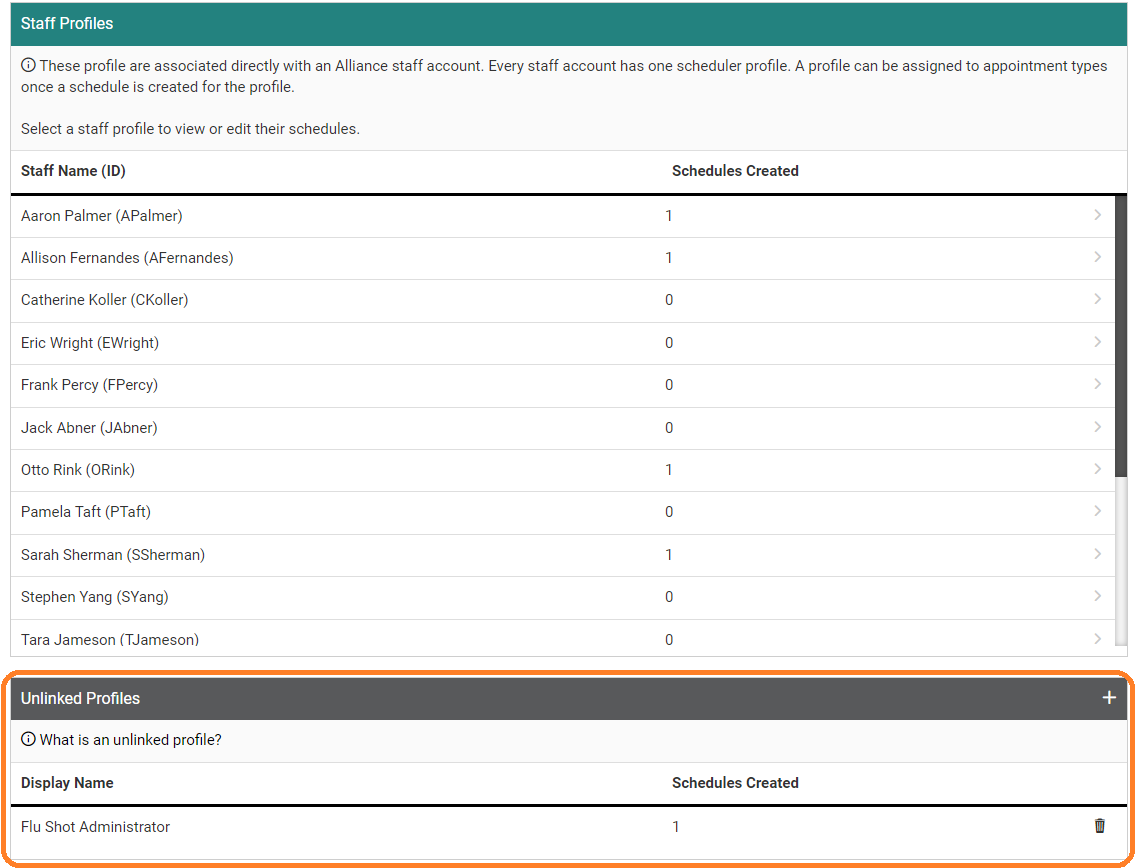 When you navigate to the Other Profiles view of the Availability tab on the Appointments page, there is a section below the list of staff accounts titled Unlinked Profiles.