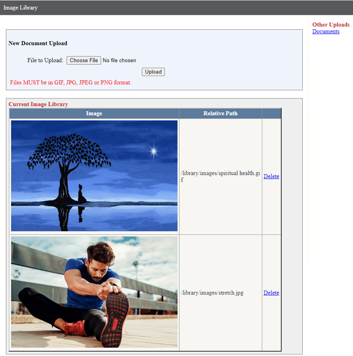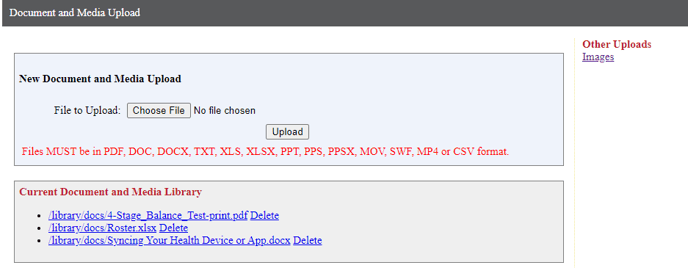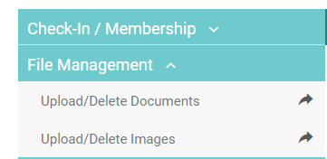 There are two options on the Content page under the File Management menu: Upload/Delete Documents and Upload/Delete Images.