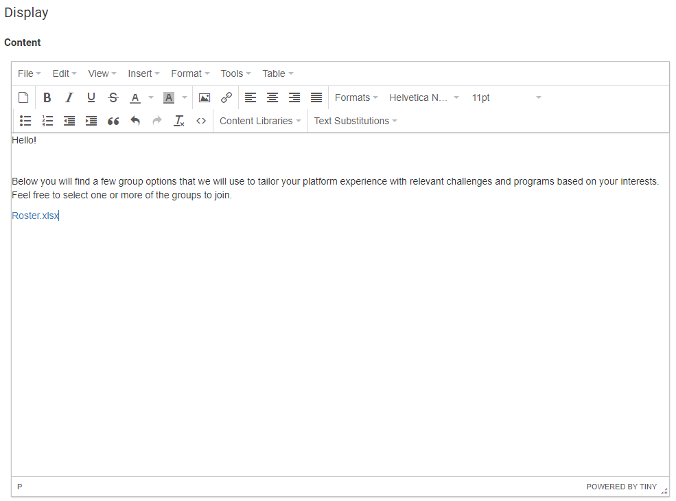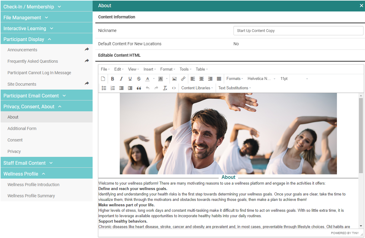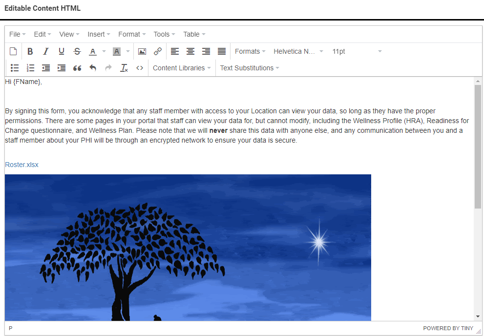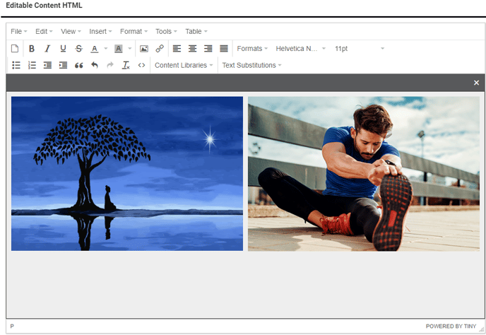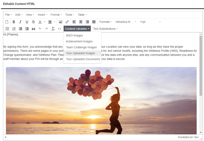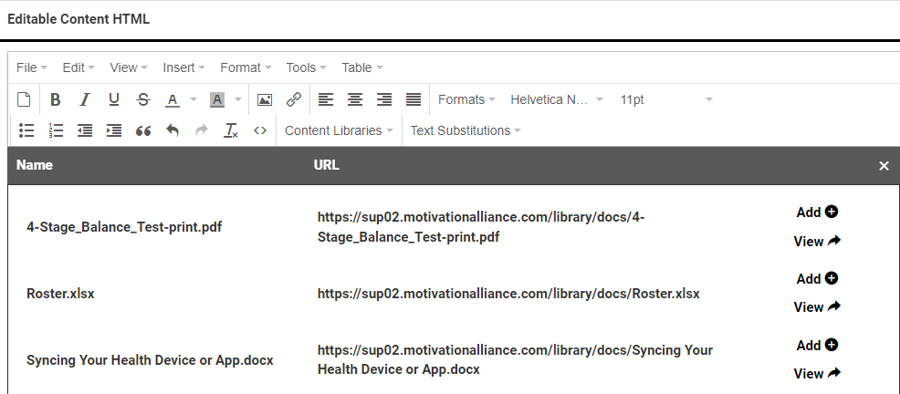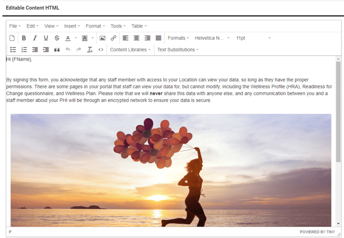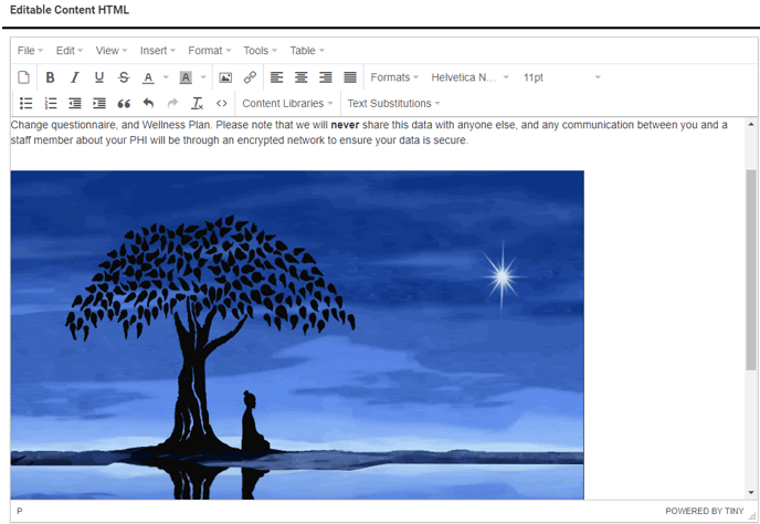 Some pages across the staff interface have an Editable Content HTML section that is used to create custom content. This looks like a standard text editor, but there are additional tools available to further customize the text and add images to your content.