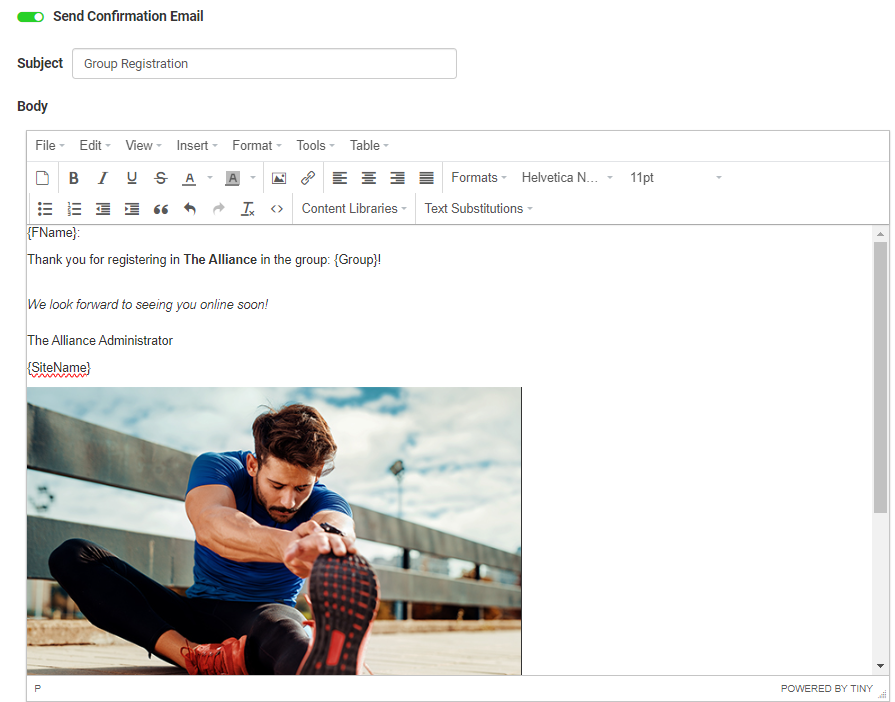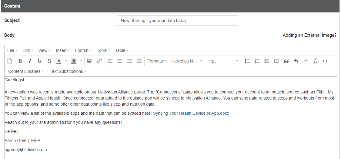 The Body section of a bulk email composed on the Communication page allows you to insert your uploaded images and documents.