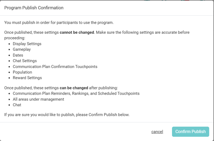- Published- The competition settings are finalized and no further changes can be made to the Settings menu pages (except for Reminders on the Communication Plan page). Changes can still be made to the Management pages.